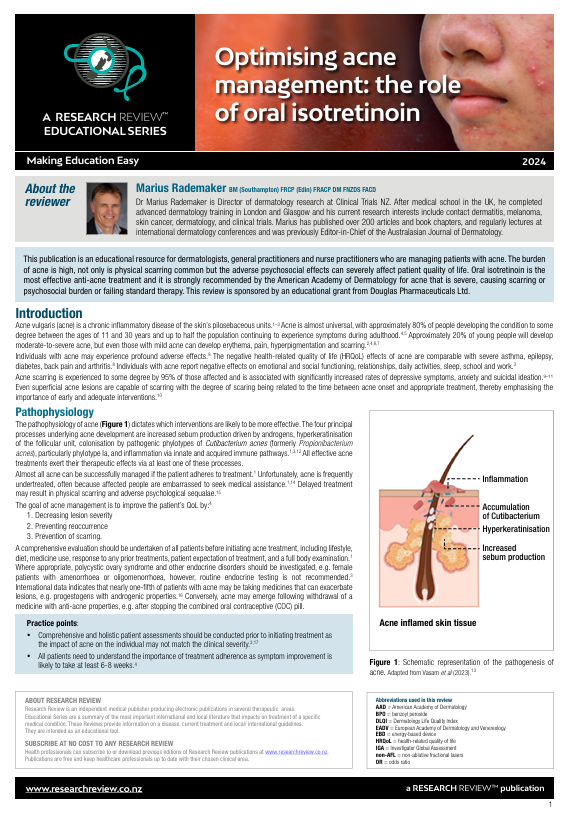 This publication is an educational resource for dermatologists, general practitioners and nurse practitioners who are managing patients with acne. The burden of acne is high, not only is physical scarring common but the adverse psychosocial effects can severely affect patient quality of life. Oral isotretinoin is the most effective anti-acne treatment and it is strongly recommended by the American Academy of Dermatology for acne that is severe, causing scarring or psychosocial burden or failing standard therapy. This review is sponsored by an educational grant from Douglas Pharmaceuticals Ltd.