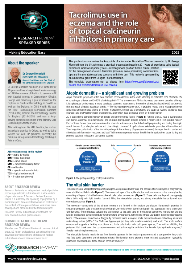 This publication summarises the key points of a November Goodfellow Webinar presented by Dr George Moncrieff from the UK, who gave a practical presentation based on 20+ years of experience using topical calcineurin inhibitors in primary care – covering how to position them in clinical practice for the management of atopic dermatitis (eczema), some prescribing considerations, tips and he also addressed any concerns with their use. This review is sponsored by an educational grant from Douglas Pharmaceuticals. The complete presentation can be viewed here https://www.goodfellowunit.org/ events-and-webinars/tacrolimus-use-eczema