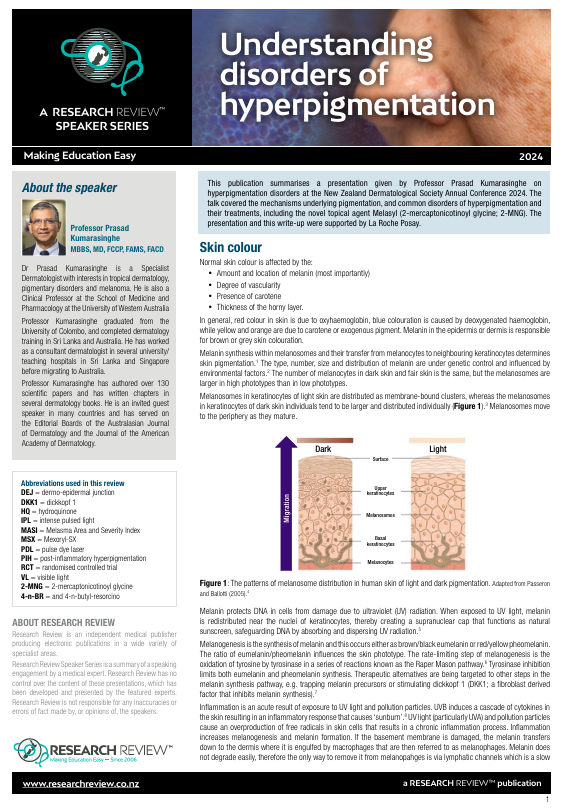 This publication summarises a presentation given by Professor Prasad Kumarasinghe on hyperpigmentation disorders at the New Zealand Dermatological Society Annual Conference 2024. The talk covered the mechanisms underlying pigmentation, and common disorders of hyperpigmentation and their treatments, including the novel topical agent Melasyl (2-mercaptonicotinoyl glycine; 2-MNG). The presentation and this write-up were supported by La Roche Posay.