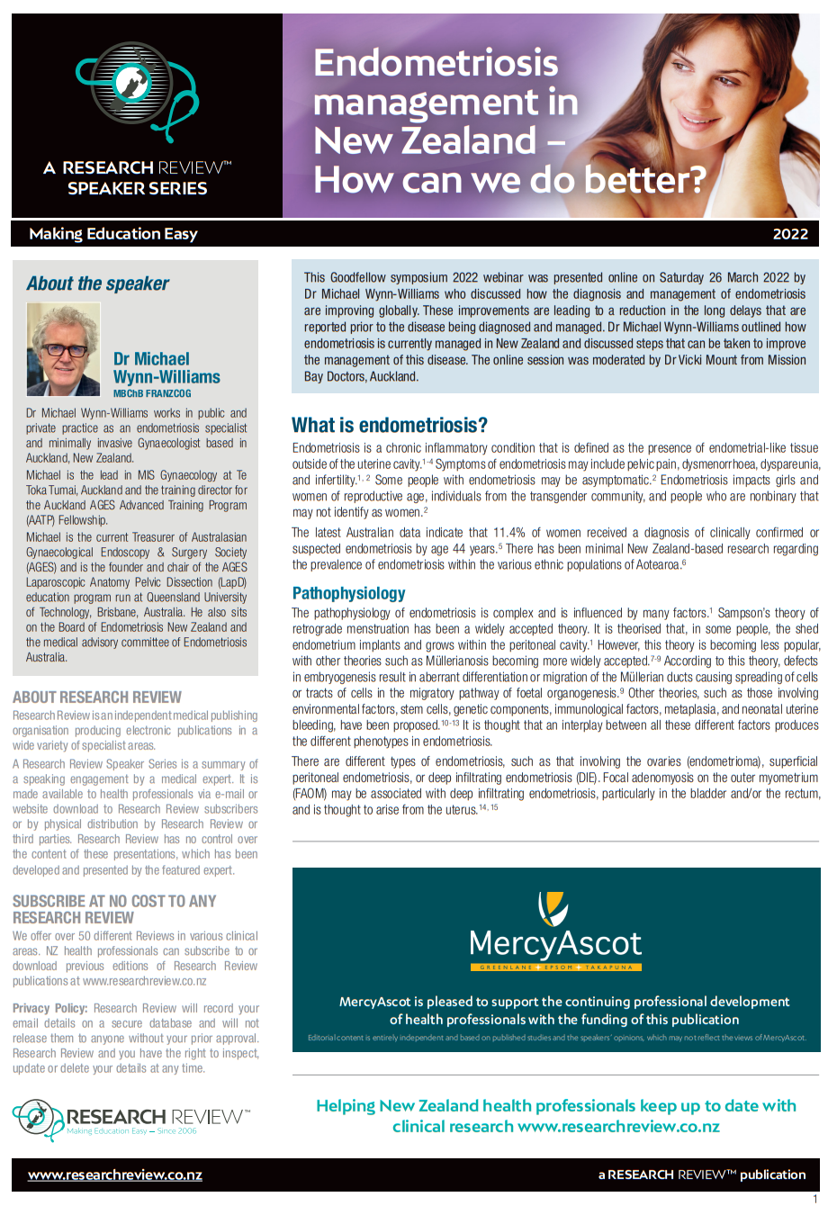This Goodfellow symposium 2022 webinar was presented online on Saturday 26 March 2022 by Dr Michael Wynn-Williams who discussed how the diagnosis and management of endometriosis are improving globally. These improvements are leading to a reduction in the long delays that are reported prior to the disease being diagnosed and managed. Dr Michael Wynn-Williams outlined how endometriosis is currently managed in New Zealand and discussed steps that can be taken to improve the management of this disease. The online session was moderated by Dr Vicki Mount from Mission Bay Doctors, Auckland.