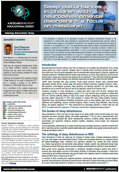 This review focuses largely on the treatment of insomnia in this paediatric group and defines the place of melatonin in its management. In 2012, The Royal Australia New Zealand College of Psychiatrists (RANZCP) provided a submission to PHARMAC for the funding of melatonin for secondary insomnia in children and adolescents with neurodevelopmental comorbidities.1 In 2015, the Pharmacists and Therapeutics Special Interest Group of the Paediatric Society of New Zealand asked PHARMAC to reconsider the priority of funding melatonin 2 mg prolonged-release tablets. As of July 2017, prolonged-release melatonin is fully funded via Special Authority for patients ≤18 years of age who have persistent and distressing insomnia secondary to NDDs (this is an off-label indication).