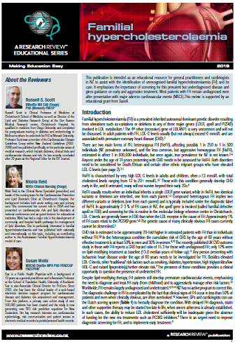 This publication is intended as an educational resource for general practitioners and cardiologists in NZ to assist with the identification of unrecognised familial hypercholesterolaemia (FH) and its care. It emphasises the importance of screening for this prevalent but underdiagnosed disease and gives guidance on early and aggressive treatment. Most patients with FH remain undiagnosed even after presentation with major adverse cardiovascular events (MACE).This review is supported by an educational grant from Sanofi.