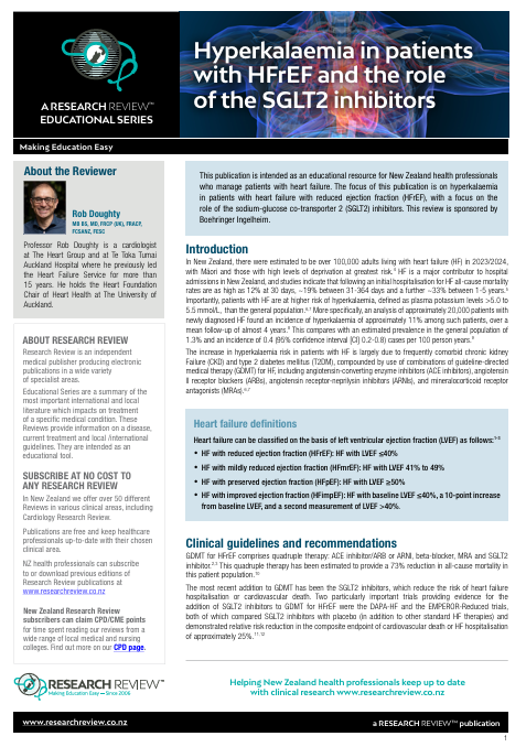 This publication is intended as an educational resource for New Zealand health professionals who manage patients with heart failure. The focus of this publication is on hyperkalaemia in patients with heart failure with reduced ejection fraction (HFrEF), with a focus on the role of the sodium-glucose co-transporter 2 (SGLT2) inhibitors.