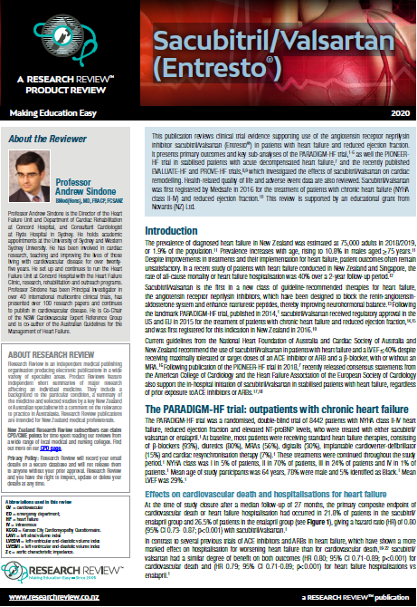 It presents primary outcomes and key sub-analyses of the PARADIGM-HF trial,1-6 as well the PIONEERHF trial in stabilised patients with acute decompensated heart failure,7 and the recently published EVALUATE-HF and PROVE-HF trials,8,9 which investigated the effects of sacubitril/valsartan on cardiac remodelling. Health-related quality of life and adverse event data are also reviewed. Sacubitril/valsartan was first registered by Medsafe in 2016 for the treatment of patients with chronic heart failure (NYHA class II-IV) and reduced ejection fraction.10 This review is supported by an educational grant from Novartis (NZ) Ltd.