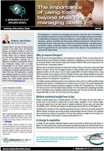 This publication is a summary of a presentation by Professor John Dixon given in Auckland at the Goodfellow Symposium on Sunday 25th March 2018. The Goodfellow symposium presented a multidisciplinary programme for general practitioners, primary healthcare nurses, urgent care physicians, registrars, specialists and other primary healthcare professionals. Professor Dixon’s presentation focused on the importance of tools such as pharmacotherapy, meal replacements and bariatric surgery, as lifestyle enablers, in the management of obesity, a disease he notes should be approached in the same manner as other chronic illnesses. This presentation was sponsored by Radiant Health.