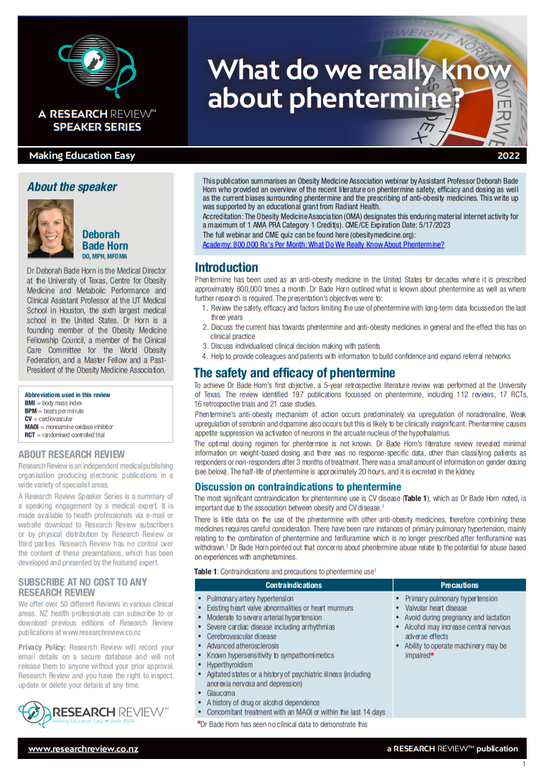 This publication summarises an Obesity Medicine Association webinar by Assistant Professor Deborah Bade Horn who provided an overview of the recent literature on phentermine safety, efficacy and dosing as well as the current biases surrounding phentermine and the prescribing of anti-obesity medicines. This write up was supported by an educational grant from Radiant Health. Accreditation: The Obesity Medicine Association (OMA) designates this enduring material internet activity for a maximum of 1 AMA PRA Category 1 Credit(s). CME/CE Expiration Date: 5/17/2023 The full webinar and CME quiz can be found here (obesitymedicine.org): Academy: 800,000 Rx's Per Month: What Do We Really Know About Phentermine?