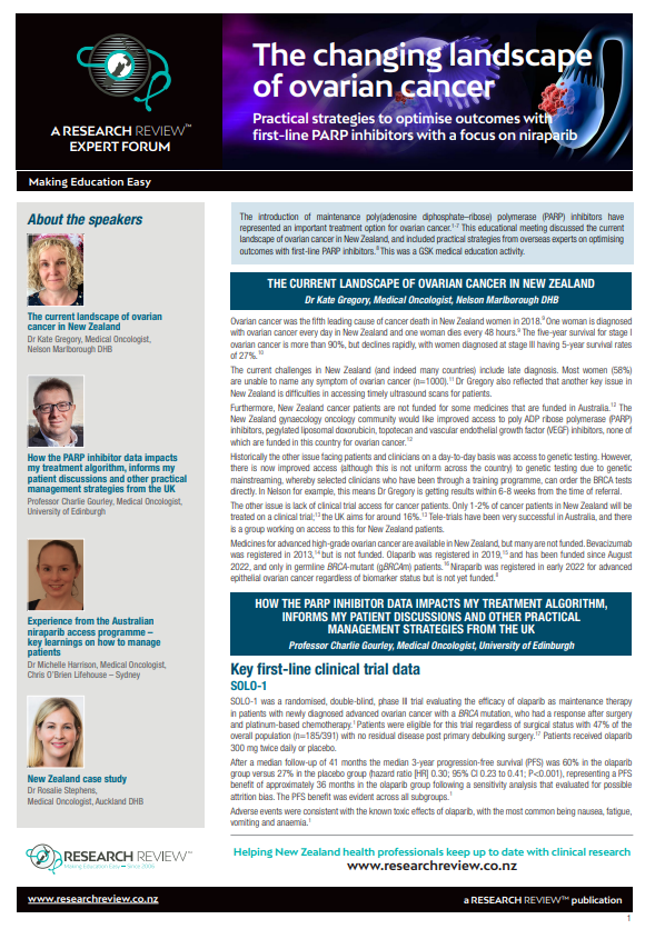 The introduction of maintenance poly(adenosine diphosphate–ribose) polymerase (PARP) inhibitors have represented an important treatment option for ovarian cancer.1-7 This educational meeting discussed the current landscape of ovarian cancer in New Zealand, and included practical strategies from overseas experts on optimising outcomes with first-line PARP inhibitors.8 This was a GSK medical education activity.
