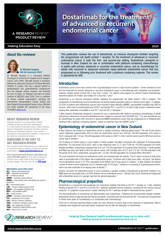 This publication reviews the use of dostarlimab, an immune checkpoint inhibitor targeting the programmed cell death protein-1 receptor, for the treatment of advanced or recurrent endometrial cancer in both the first- and second-line setting. Dostarlimab (Jemperli) is licensed in New Zealand for use in combination with platinum-containing chemotherapy in adults with primary advanced or recurrent endometrial cancer, and as monotherapy for adults with recurrent or advanced mismatch repair-deficient endometrial cancer that has progressed on or following prior treatment with a platinum-containing regimen.