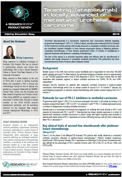 The aim of this review is to describe important safety and efficacy data for atezolizumab in