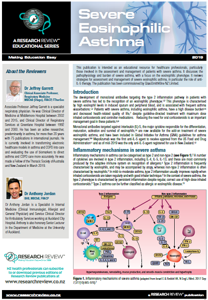 This publication is intended as an educational resource for healthcare professionals, particularly those involved in the assessment and management of patients with severe asthma. It discusses the pathophysiology and burden of severe asthma, with a focus on the eosinophilic phenotype. It reviews strategies for assessment and management of severe eosinophilic asthma, in particular the role of anti-IL-5 therapy. The publication has been commissioned by GlaxoSmithKline NZ Limited.