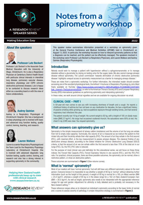 This speaker review summarises information presented at a workshop on spirometry given at the General Practice Conference and Medical Exhibition (GPCME) held in Christchurch on August 13, 2022. In particular, the workshop focused on how to interpret spirometry patterns so that a diagnosis can be reached, and the patient can be effectively managed. The speakers involved in the workshop were Professor Lutz Beckert (a Respiratory Physician), and Lauren Wallace and Audrey Quinlan (Respiratory Physiologists).