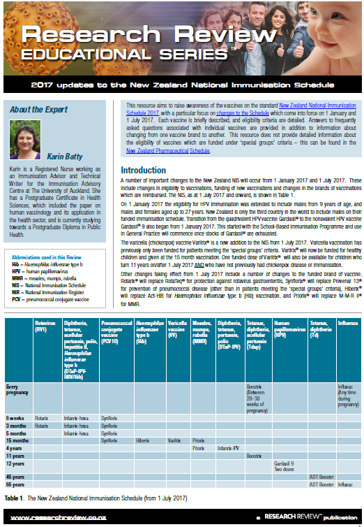 This resource aims to raise awareness of the vaccines on the standard New Zealand National Immunisation Schedule 2017, with a particular focus on changes to the Schedule which come into force on 1 January and 1 July 2017. Each vaccine is briefly described, and eligibility criteria are detailed. Answers to frequently asked questions associated with individual vaccines are provided in addition to information about changing from one vaccine brand to another.