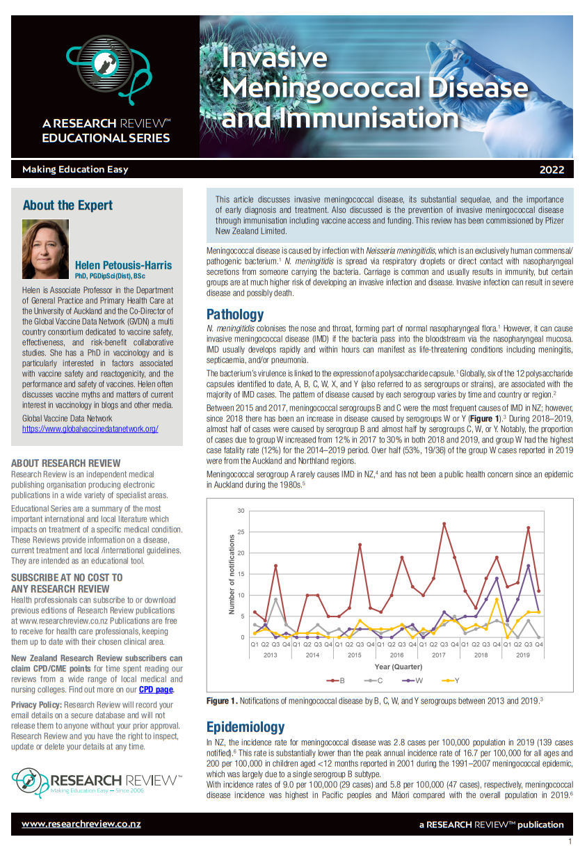 This article discusses invasive meningococcal disease, its substantial sequelae, and the importance of early diagnosis and treatment. Also discussed is the prevention of invasive meningococcal disease through immunisation including vaccine access and funding. This review has been commissioned by Pfizer New Zealand Limited.