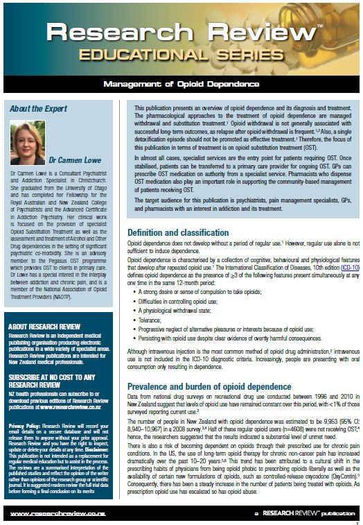 This publication presents an overview of opioid dependence and its diagnosis and treatment. The pharmacological approaches to the treatment of opioid dependence are managed withdrawal and substitution treatment. Opioid withdrawal is not generally associated with successful long-term outcomes, as relapse after opioid withdrawal is frequent. Also, a single detoxification episode should not be promoted as effective treatment. Therefore, the focus of this publication in terms of treatment is on opioid substitution treatment (OST).
