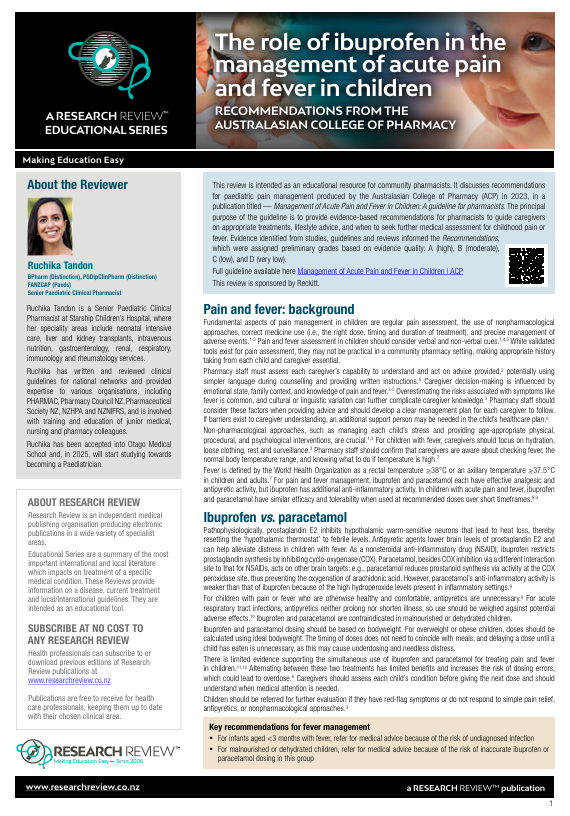 This review is intended as an educational resource for community pharmacists. It discusses recommendations for paediatric pain management produced by the Australasian College of Pharmacy (ACP) in 2023, in a publication titled — Management of Acute Pain and Fever in Children: A guideline for pharmacists. The principal purpose of the guideline is to provide evidence-based recommendations for pharmacists to guide caregivers on appropriate treatments, lifestyle advice, and when to seek further medical assessment for childhood pain or fever. Evidence identified from studies, guidelines and reviews informed the Recommendations, which were assigned preliminary grades based on evidence quality: A (high), B (moderate), C (low), and D (very low).